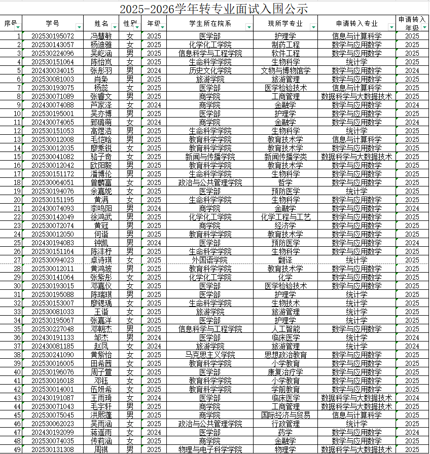 本次我院共收到128名学生提交的转专业申请,经我院笔试考核,有冯慧敏等49名同学具有面试资格,请有面试资格的同学准时到我院参加面试,请准备2分钟左右的自我介绍。请携带好身份证或者学生证。
