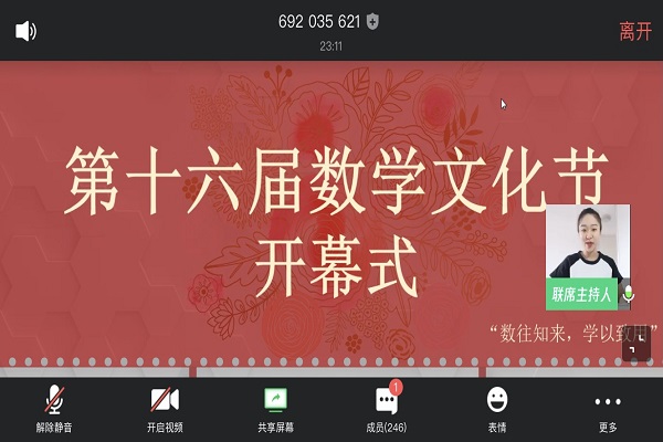 谢资清院长为开幕式致辞。她对线上教学有序推进表示高度认可,肯定了同学们在家的优异表现,并高度赞扬了我院积极投身于疫情防控的志愿者同学。她指出,为疫情防控贡献力量“匹夫有责”。谢资清院长介绍了数学文化节的由来与发展历史,并表示,数学在各个领域都有至关重要的作用;她还回顾了历届数学文化节开展的特色活动,对数学文化节的意义和作用表示肯定,她希望同学们踊跃参与活动,争做数学达人,激发起对数学知识的渴望。谢资清院长向同学们介绍了此次活动邀请到的嘉宾,她希望同学们以此为契机,做到爱数学、学数学、用数学。最后,她向全体师生送上祝福,并宣布第十六届数学文化节正式开始。