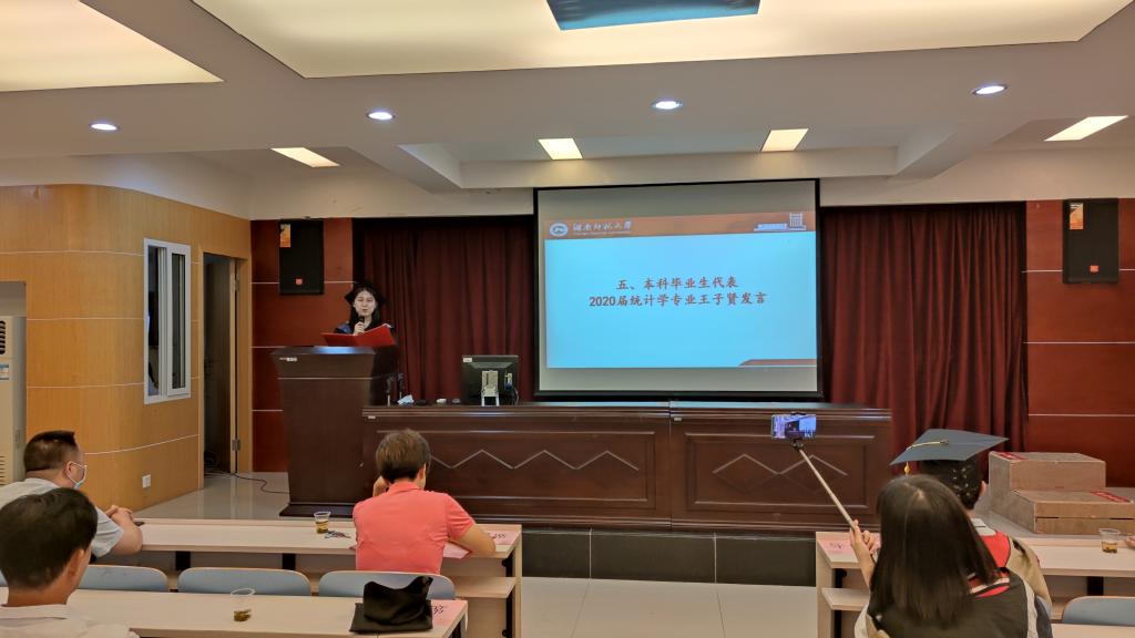 10:18分,伴随着雄壮的国歌声,数统院2020届毕业生毕业典礼暨学位授予仪式正式开始,辅导员郭健主持仪式。谢资清院长因重要会议不能到达典礼现场,她通过视频为毕业生们送上祝福。她谈到,虽然我们面临前所未有的大变局,但是只要我们踏实做事,做好自己的事,我们一定可以乘风破浪,谢资清院长祝福毕业生们鹏程万里,展翅高飞。