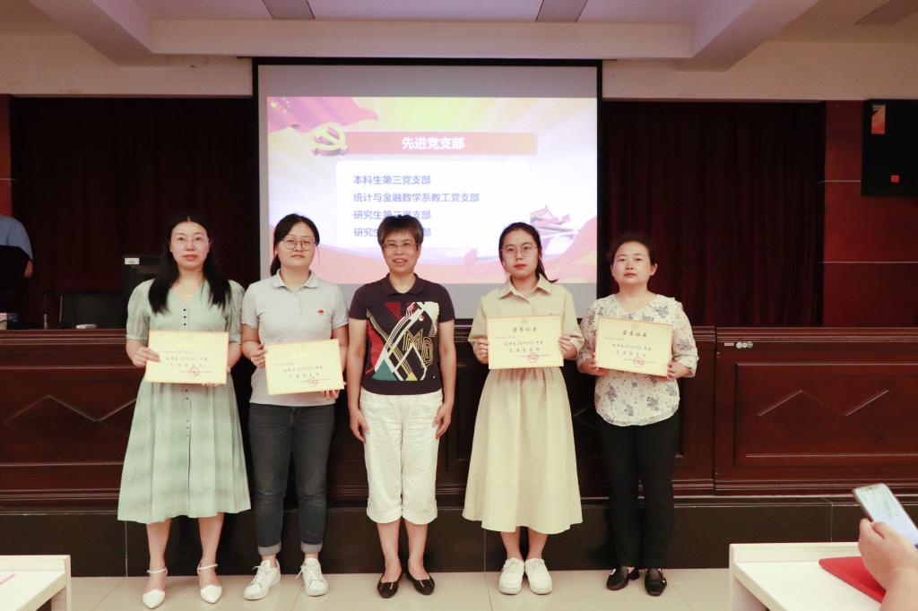 高旗举宣读表彰决定,对获得学校和学院表彰的先进党支部、优秀个人表示热烈的祝贺。研究生第一党支部获评为学校先进党支部,熊卓然同志获评为学校优秀党务工作者,王小红、张云峰、何欣3位同志获评为学校优秀共产党员;统计与金融数学系教工党支部等4个党支部获评为学院“先进党支部”,杜涛等15位同志被授予学院“优秀党务工作者”荣誉称号,李求来等24位同志被授予“优秀共产党员”荣誉称号。党委委员颜中玉,高旗举、熊绍英、刘亚琴、李俐、欧辉为获奖集体和个人颁奖。杜涛、彭瑶代表获奖者上台发言,他们分享了自己的认识与思考,并表示将继续努力,不负党的培养,在今后的工作和学习中取得更大的进步。