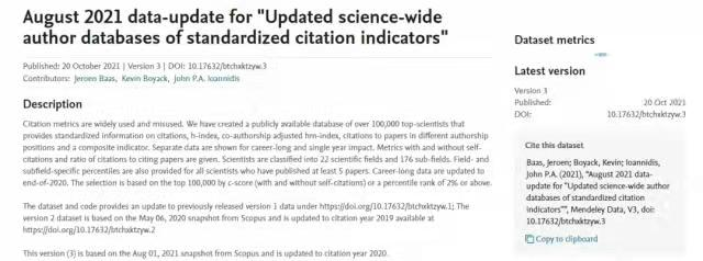 本次发布的为2021年版本,与2020年公布的版本有所差异,本次发布时间为2021年10月20日,统计数据时间节点为1960-2021年,涵盖全球186177位科学家。榜单主要分为“终身科学影响力排行榜(1960-2021)”和“2021年度科学影响力排行榜”两个榜单。