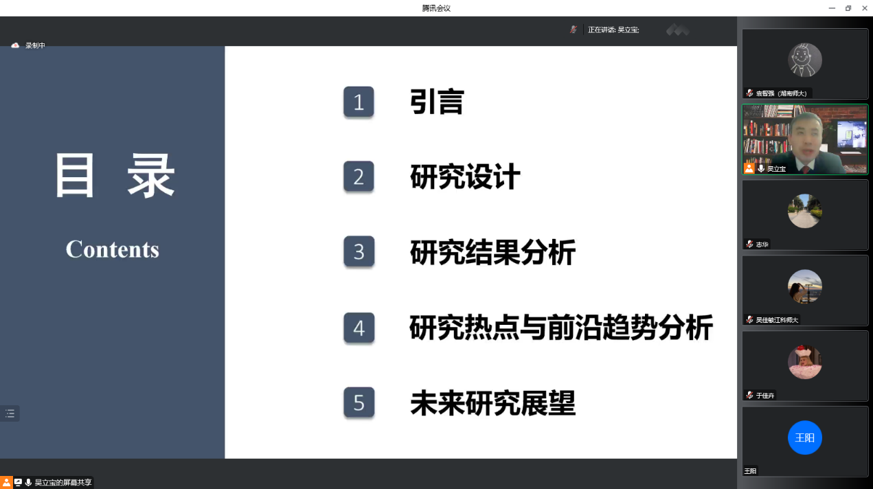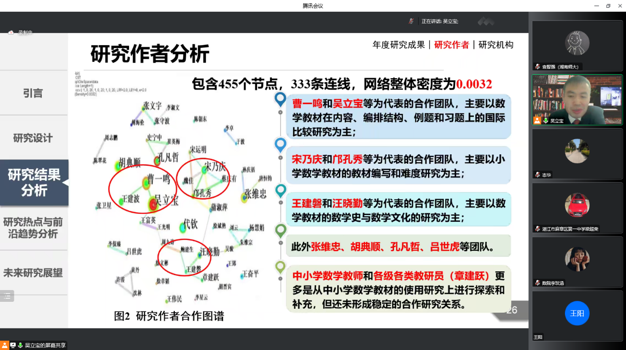 2022年10月22日星期六晚上7:30-9:30,天津师范大学吴立宝教授做客英国365上市公司“麓山数学教育论坛”,通过腾讯会议平台进行了一场主题为“新世纪以来我国中小学数学教材研究热点、演进与展望”的讲座。此次讲座由数学系副主任袁智强主持。