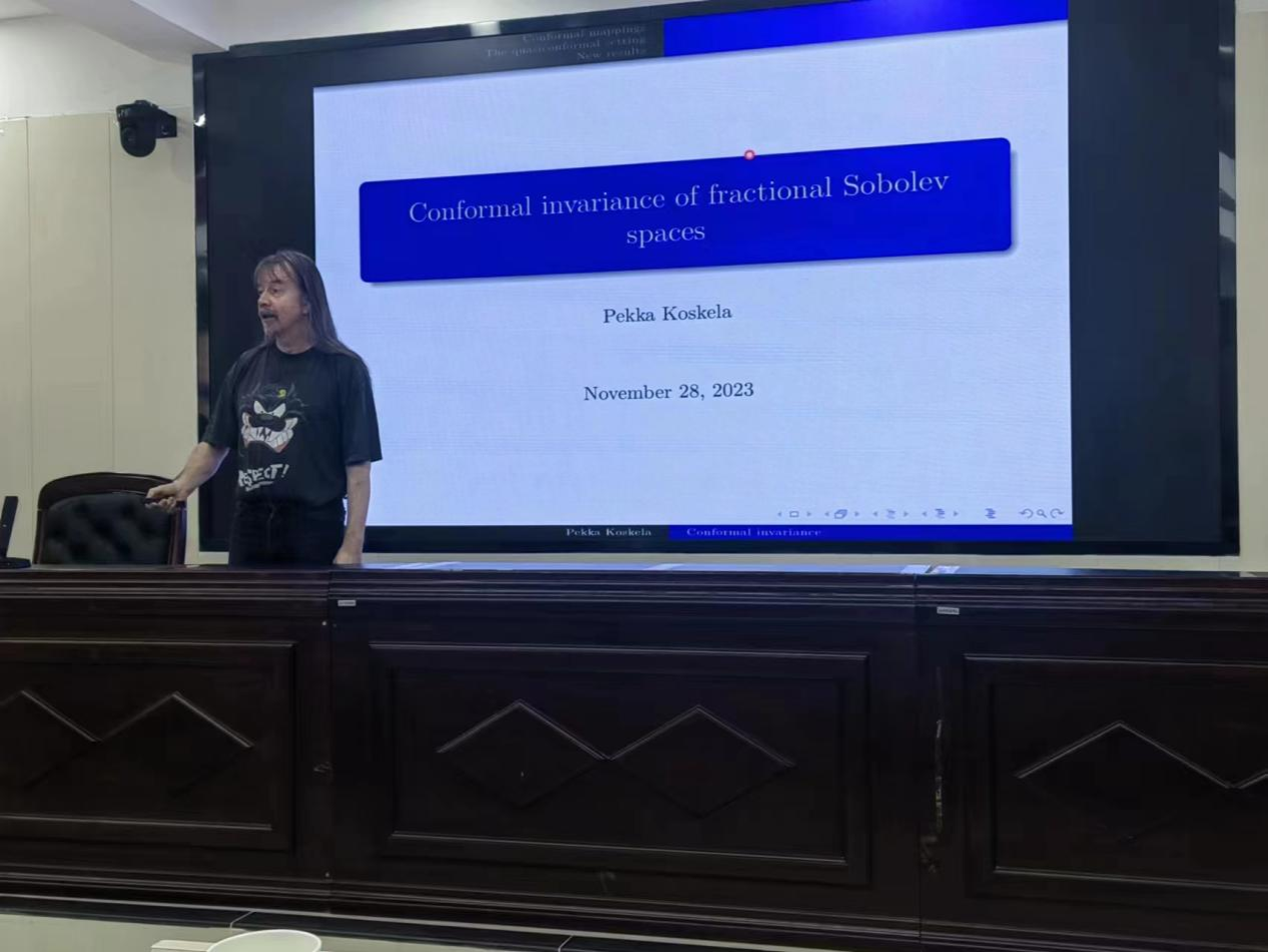 Pekka Koskela教授的报告内容丰富,由浅入深,从复分析中的解析函数与共形映射讲起,延伸到拟共形映射的研究,并介绍了分式Sobolev空间的(拟)共形不变性及其任然存在的一些热点问题,最后对他及其团队围绕此性质所做的最新工作做了介绍。