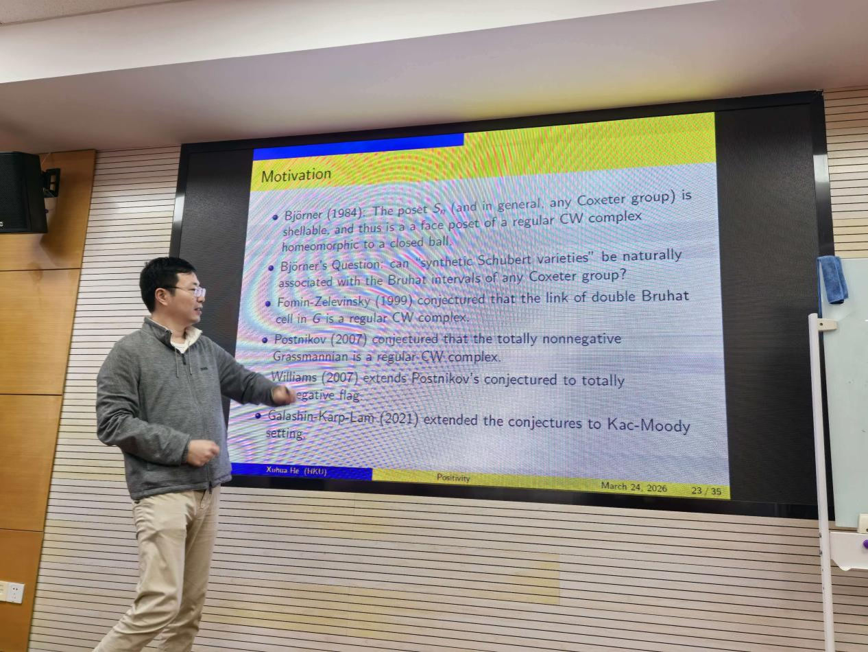 2026年3月24日下午,“代数与几何系列报告”在格物楼英国365上市公司数学研究中心528报告厅隆重举行。国际知名数学家、香港科学院院士、香港大学讲座教授何旭华应邀作了题为“Total positivity: combinatorics,geometry, and representation theory”的学术报告。