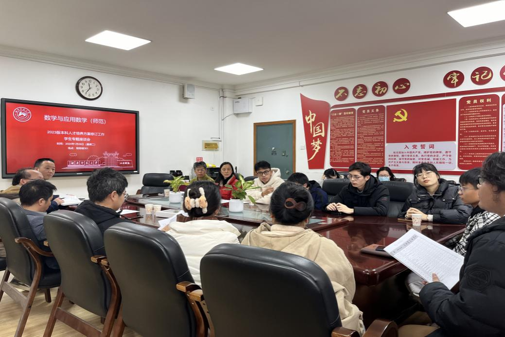 (通讯员 覃卫民 周逸)为适应高等教育教学改革发展新形势新任务新要求,进一步完善人才培养体系,不断提高本科教育教学质量,数统院数学与应用数学(师范)专业于2023年9月启动了2023版本科人才培养方案修订工作。2024年1月9日上午11:00至中午12:30在格物楼301会议室召开了学生专题座谈会。数统院党委书记颜中玉、副院长郭水霞、数学系主任赖柏顺、数学系副主任袁智强、孙少辉、学工办主任李俐、教务办主任余雅睿、2021级辅导员周逸以及数学与应用数学专业各个年级共12名学生代表参加会议,会议由数学与应用数学专业负责人袁智强教授主持。