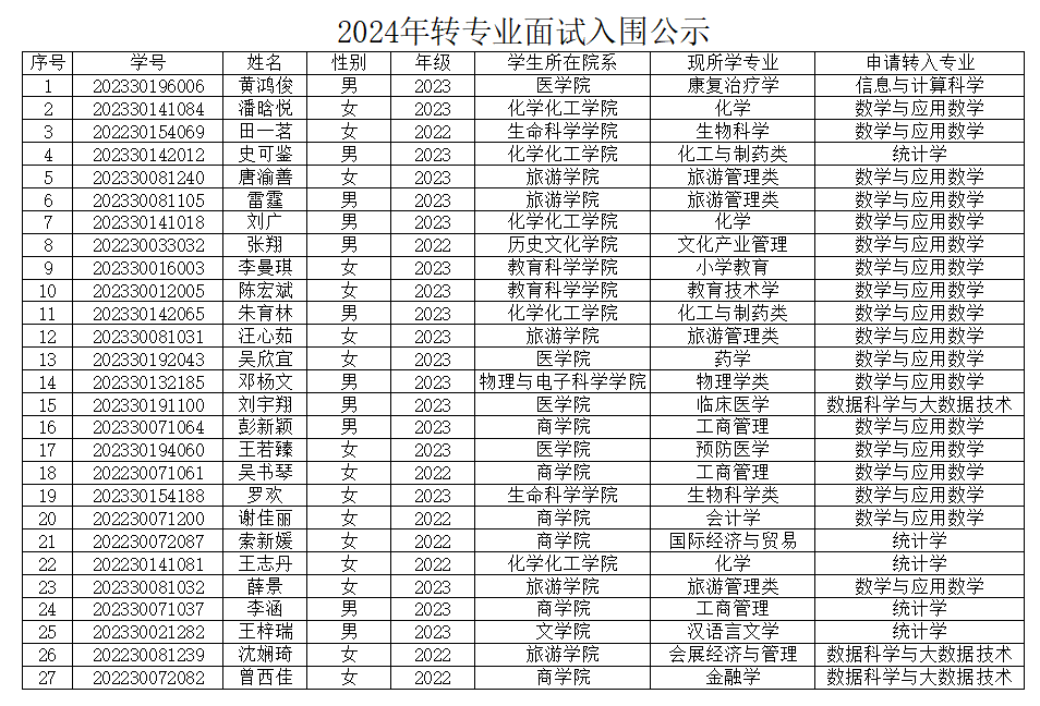 本次我院共收到28名学生提交的转专业申请,经我院笔试考核,有黄鸿俊等27名同学具有面试资格,请有面试资格的同学准时到我院参加面试,请准备2分钟左右的自我介绍。