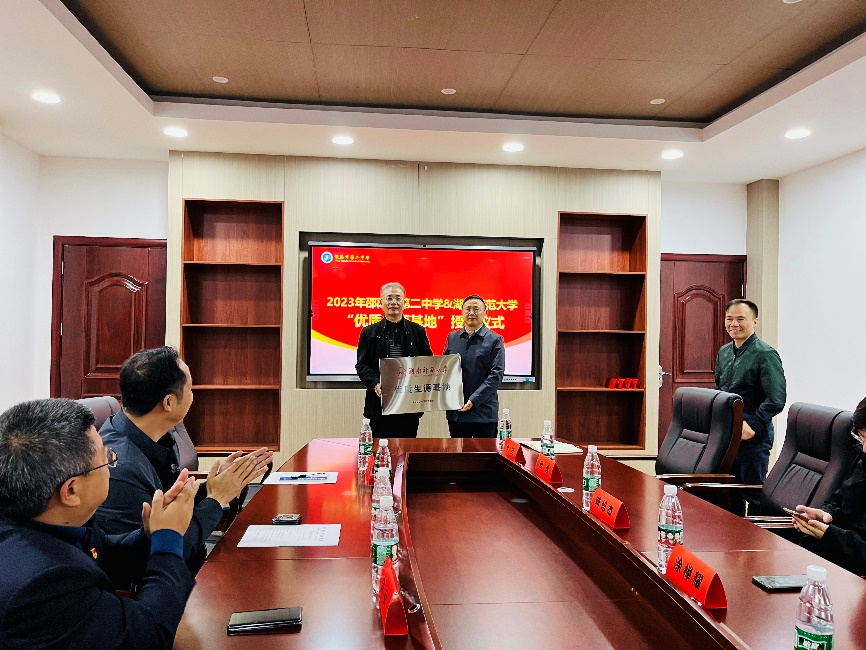 授牌仪式上,涂榉耀代表学院对邵阳市教育系统的关心和支持表示感谢,他介绍了学院人才培养、英国365、办学成果等基本情况,希望未来能开展更紧密的合作交流,让更多的邵阳学生了解师大,来师大数统学院深造,携手为国家培育更多创新人才。